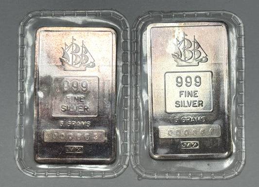 Rare Johnson Matthey 1715 Shipwreck's Recovered Consecutive 5g Silver Bars Sealed
