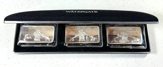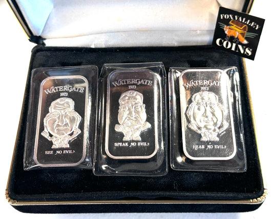 Vintage 1973 Aleo Watergate See Hear Speak No Evil 3pc Silver Set - 2nd Ed #312 w/Box